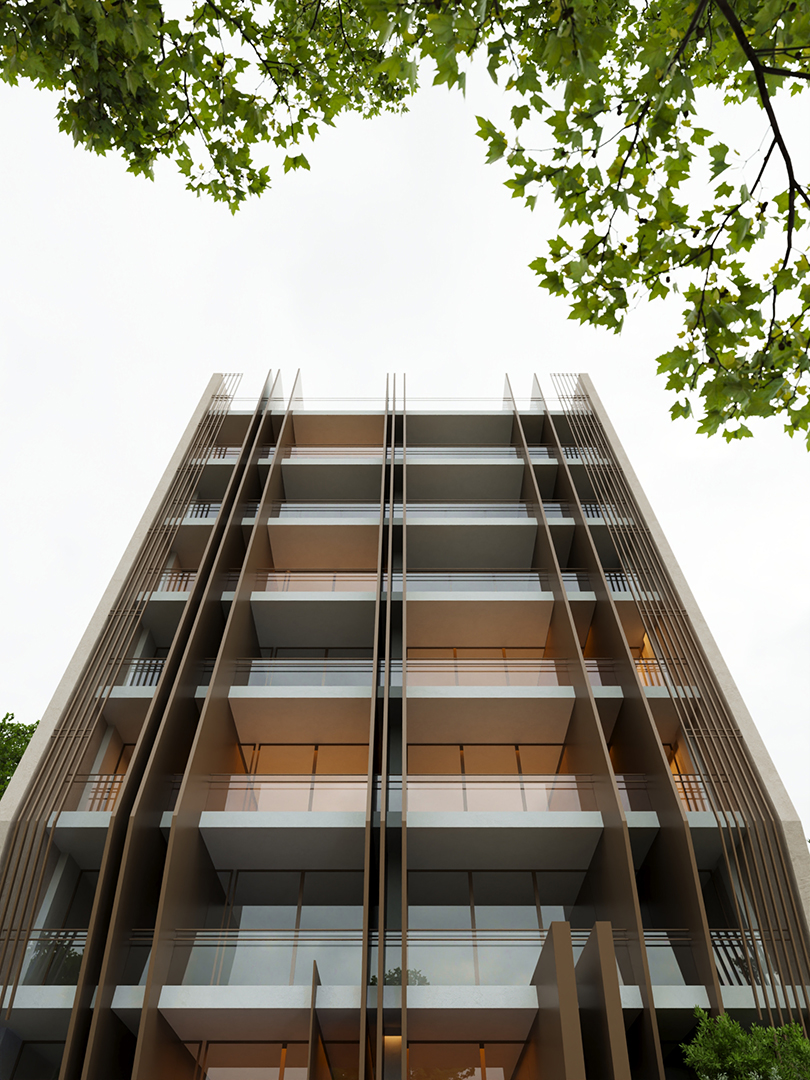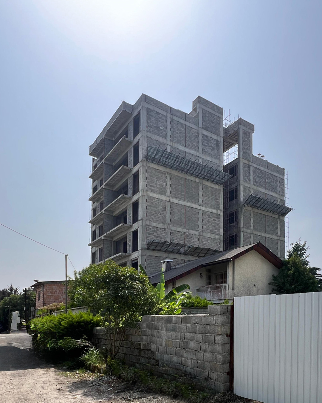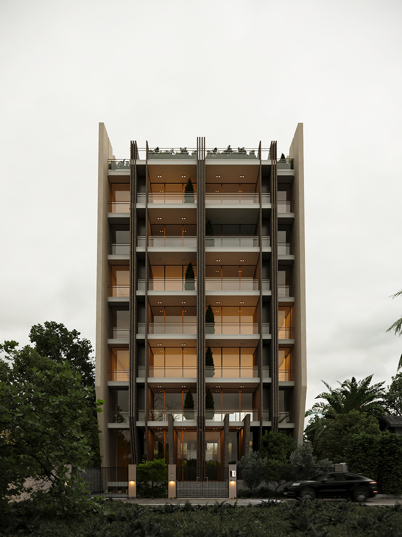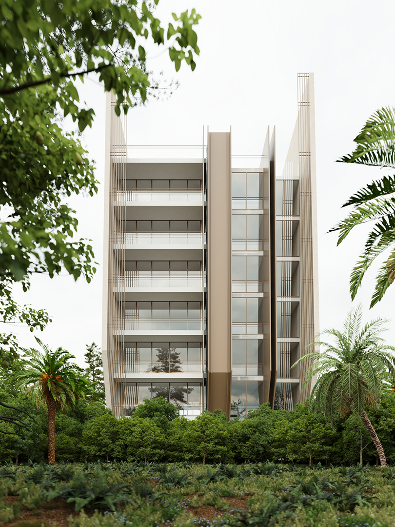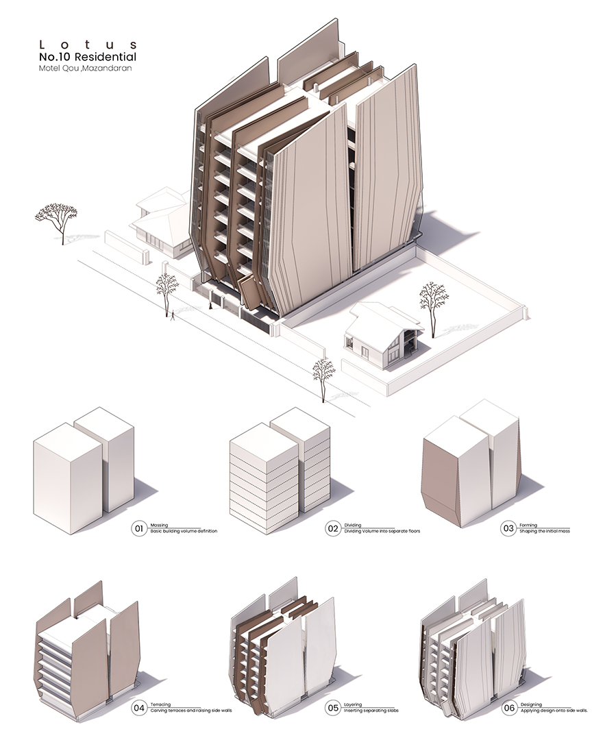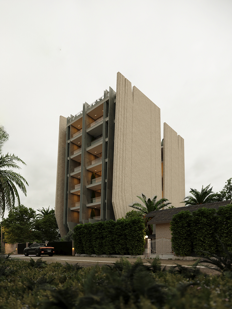 پروژه در بخش غربی بلوار اصلی متل قو واقع شده است،نمای جانبی ساختمان بیشترین مواجه مخاطب با پروژه را شامل می شود، رویکرد طراحی ما به گونه ای پیشرفت تا نمای جانبی به مثابه نمای اصلی در نظر گرفته شود،ساختار اسکلت موجود در قالب جدیدی فرو رفت تا ساختمان را در برگیرد و نمای جانبی جای خود را به صفحات ضخیمی داد ،که وید میانی برشی بر پیکره این پوسته ضخیم بود ،اثر این برش ها در ساختار بام نیز تداوم یافت تا روزنه هایی به مناظر غرب و شرق باز کند، لایه های ضخیم کناری،فشرده شدند و لایه های میانی جداکننده واحدها را ساختند. ساختار کلی حجم در اثر تکرار و برهم نشینی این لایه ها شکل گرفت ،امتداد این صفحات درون پروژه ، فضای داخلی لابی و واحدها را تحت تاثیر قرار داد به گونه ای که جداره بیرون به اتمسفر درون سرایت کند .
