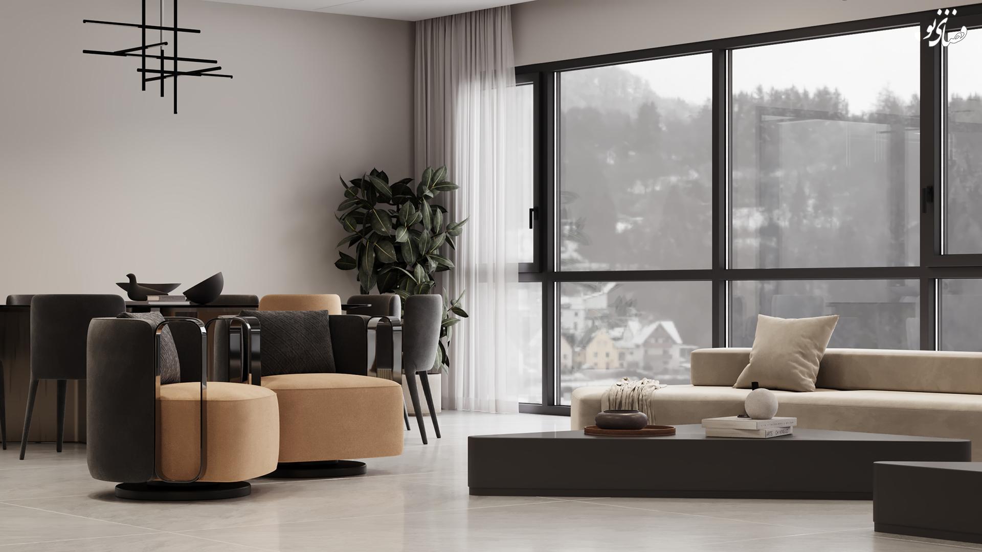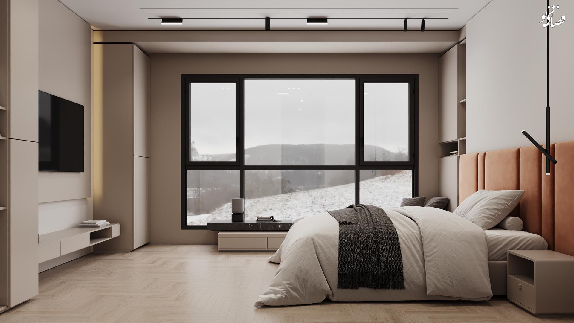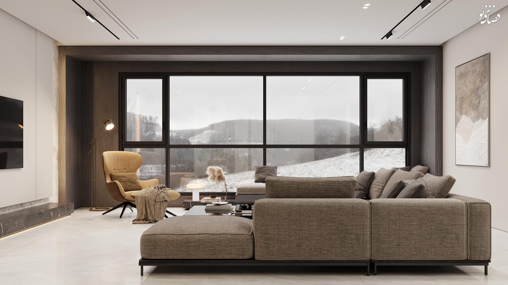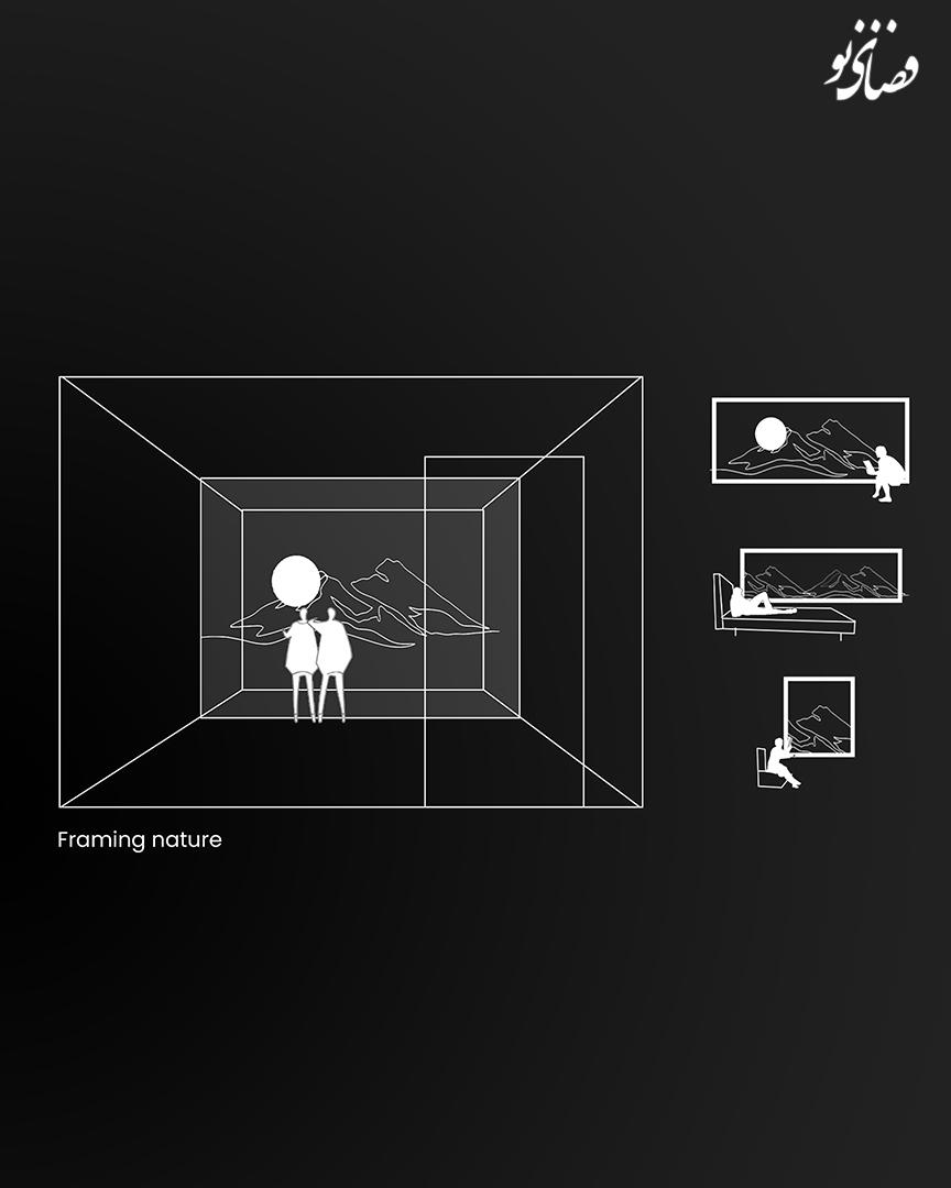 واحد مسکونی ۴۵۰ متری، واقع در محله زعفرانیه و در مجاورت کوههای شمال تهران، از چشماندازی بینظیر بهرهمند بود. در طراحی، هر فضا با پنجرههایی رو به کوه و طبیعت پیرامون مواجه شدیم؛ فریمهایی که همچون قاب عکسهایی طبیعی، منظره را به درون خانه دعوت میکردند. ما این قابها را در هر فضا برجسته کردیم تا نهتنها کیفیت بصری چشمگیری ایجاد شود، بلکه امکان نشستن، اندیشیدن و مطالعه در کنار این چشماندازها نیز فراهم آید. تلاش کردیم تا با ایجاد کنتراست شدید میان روشنایی فضاهای داخلی و پسزمینه کوه، این فریمها را به عناصری شاخص و شاعرانه در طراحی بدل کنیم تا قابهایی وسیع از مناظر اطراف ایجاد کنیم.