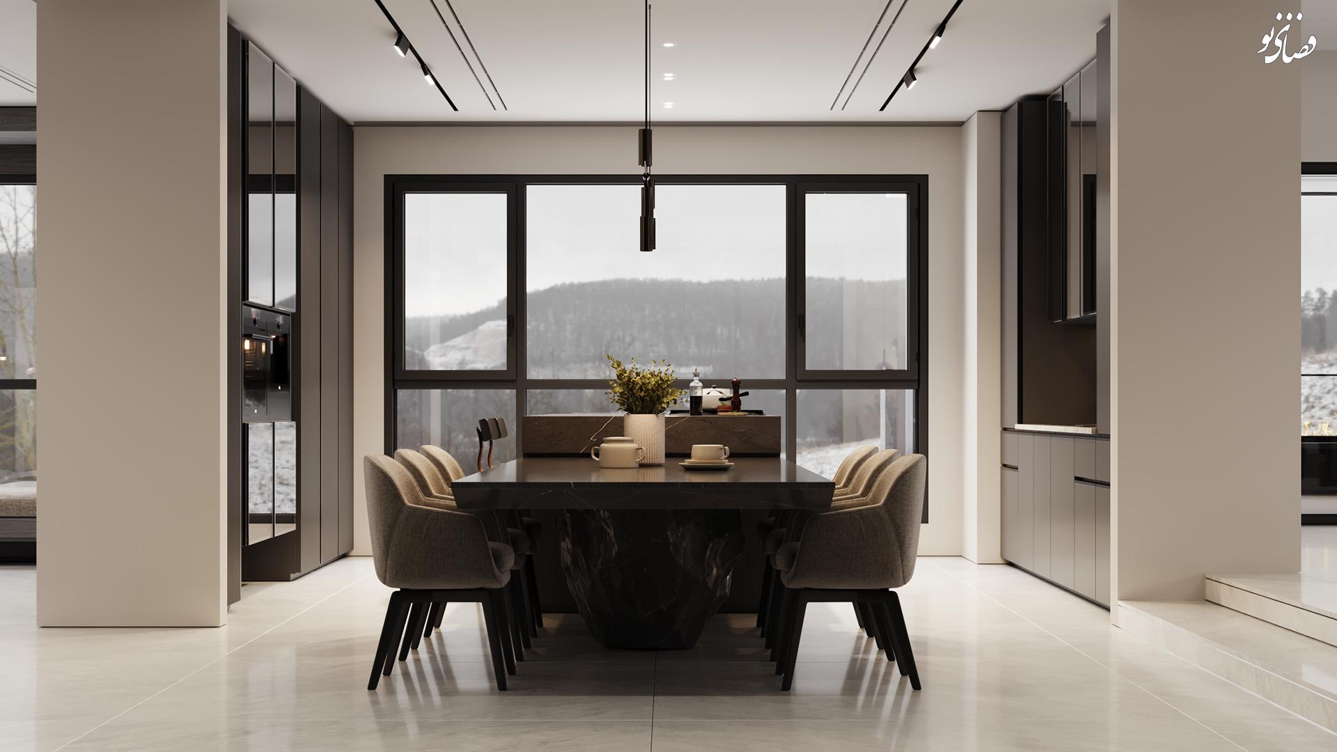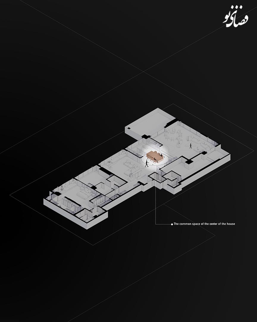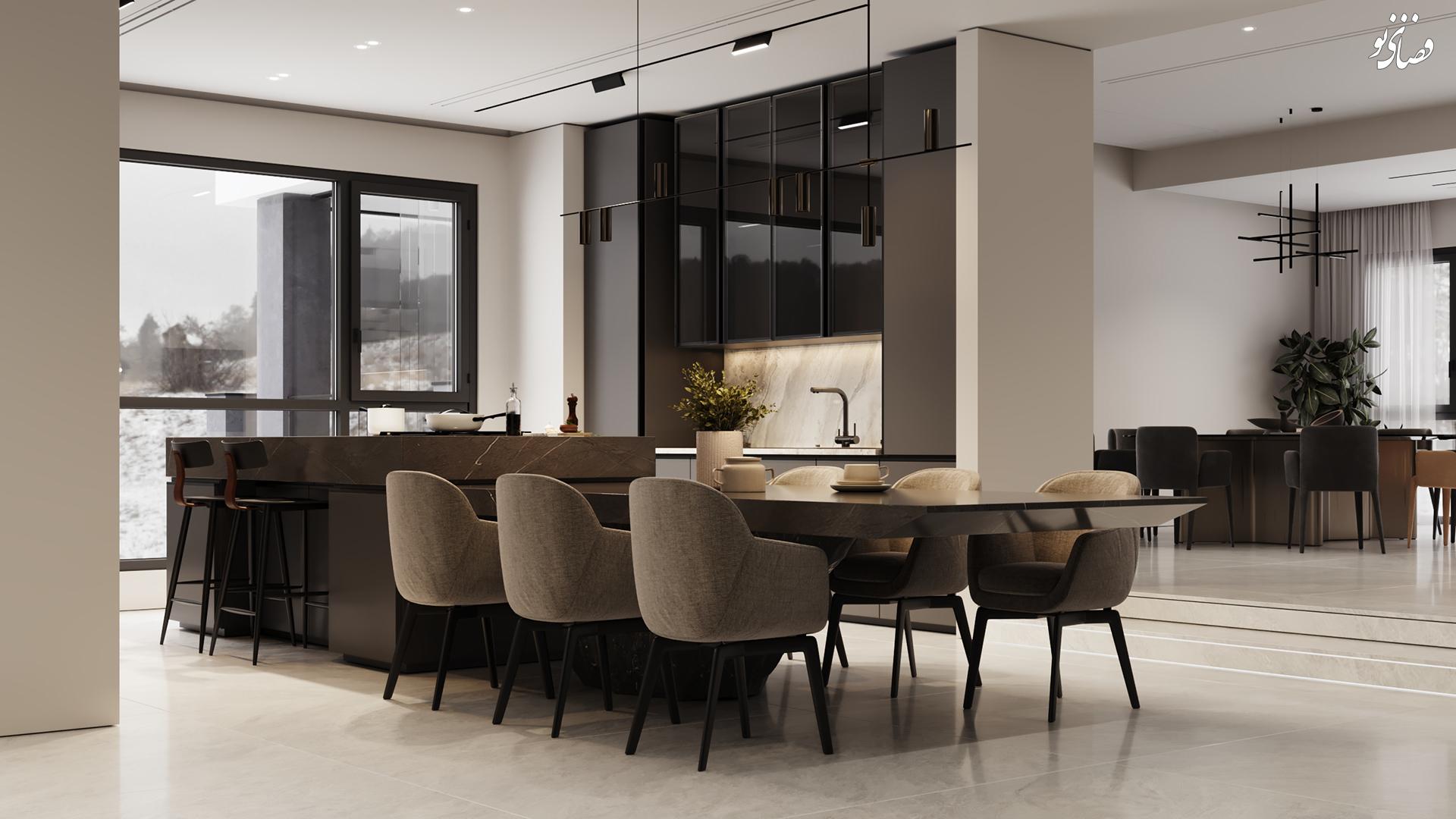 در بازنگری روابط فضایی خانه، آشپزخانه دیگر گوشهنشین و پنهان نبود. آن را به قلب فضای عمومی منتقل کردیم—در میانهی نشیمن، پذیرایی و نزدیک به تراس—تا به عنصری پیونددهنده بدل شود. این جانمایی آشپزخانه را به مرکز زندگی خانوادگی و مهمانیها تبدیل کرد؛ فضایی برای گفتوگو، با امکان دید و دسترسی همزمان به فضاهای پیرامون.