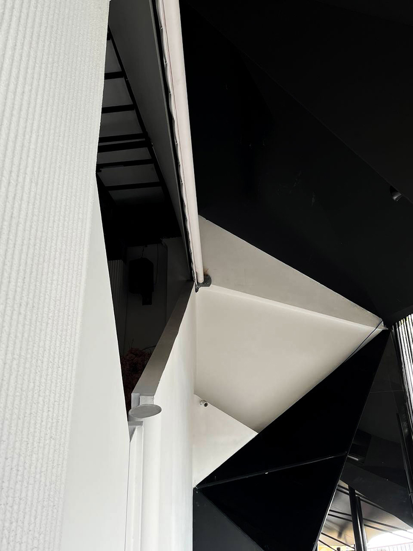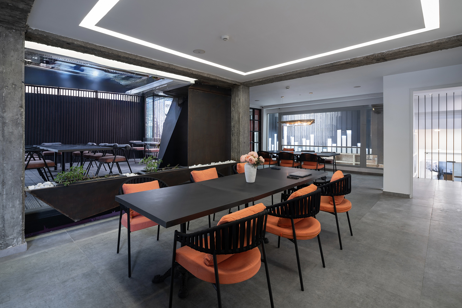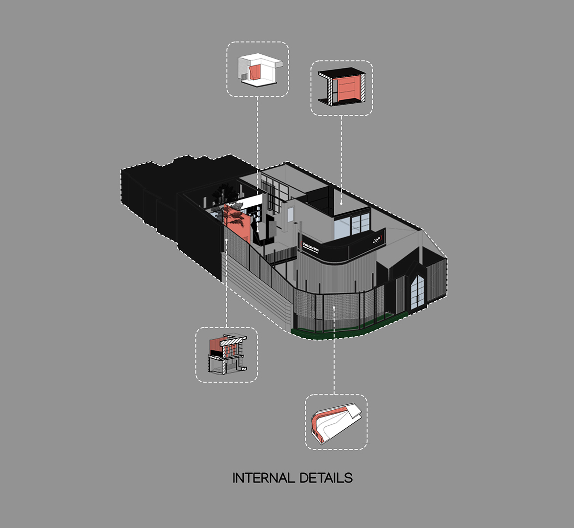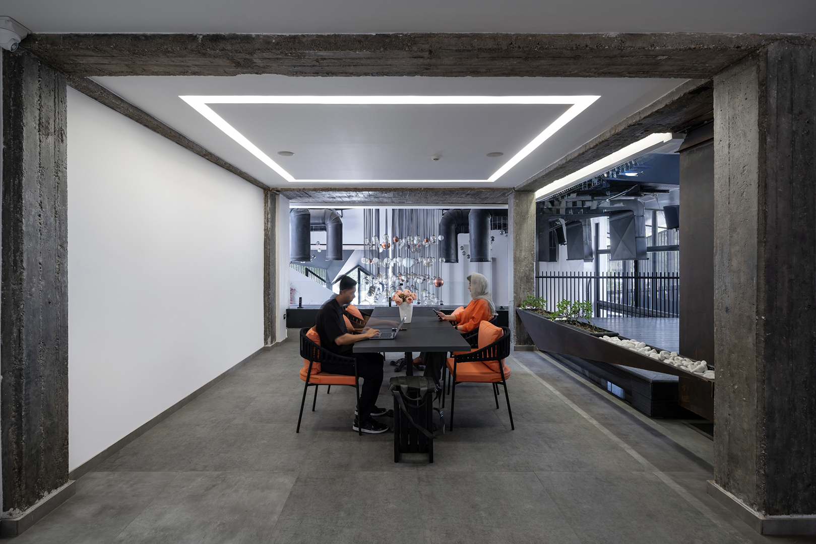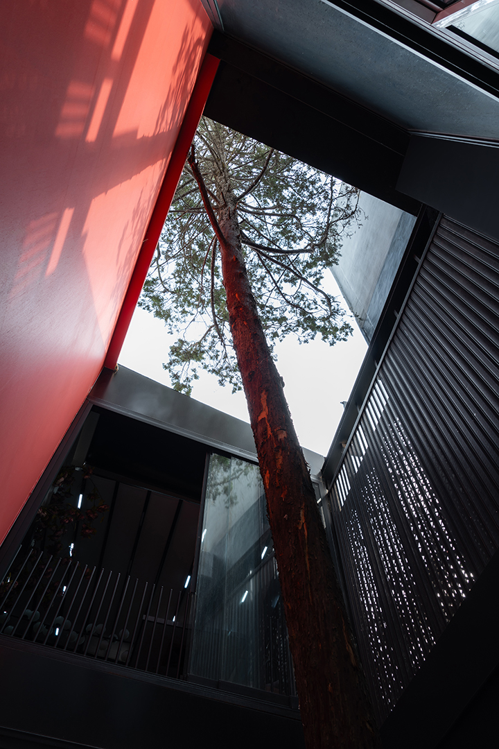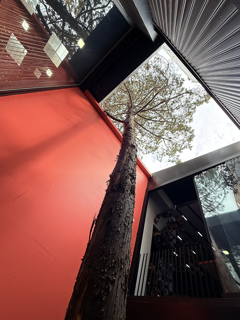 درون ساختمان، تضاد میان سازههای فولادی تیره و کفسازی روشن، عمق بصری فضا را افزایش میدهد. درخت کاج تنهای موجود در سایت، که پیشتر نادیده گرفته شده بود، اکنون بهعنوان نقطه کانونی در توالی منظر ورودی ادغام شده است.