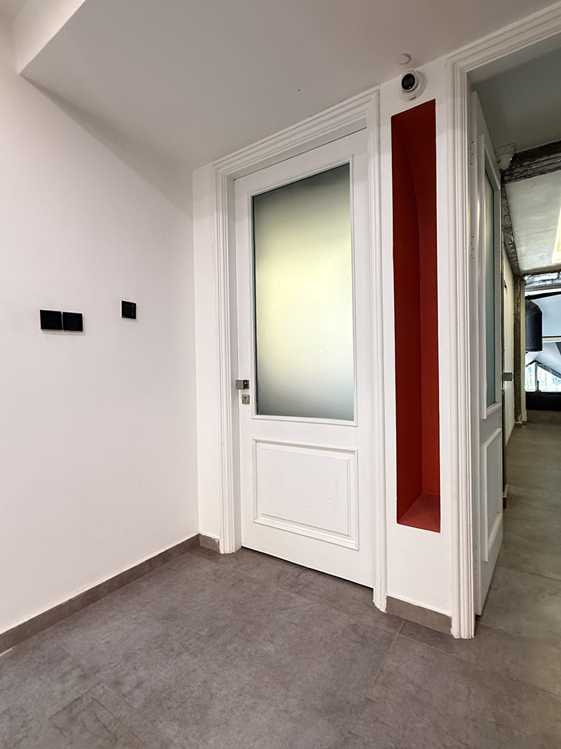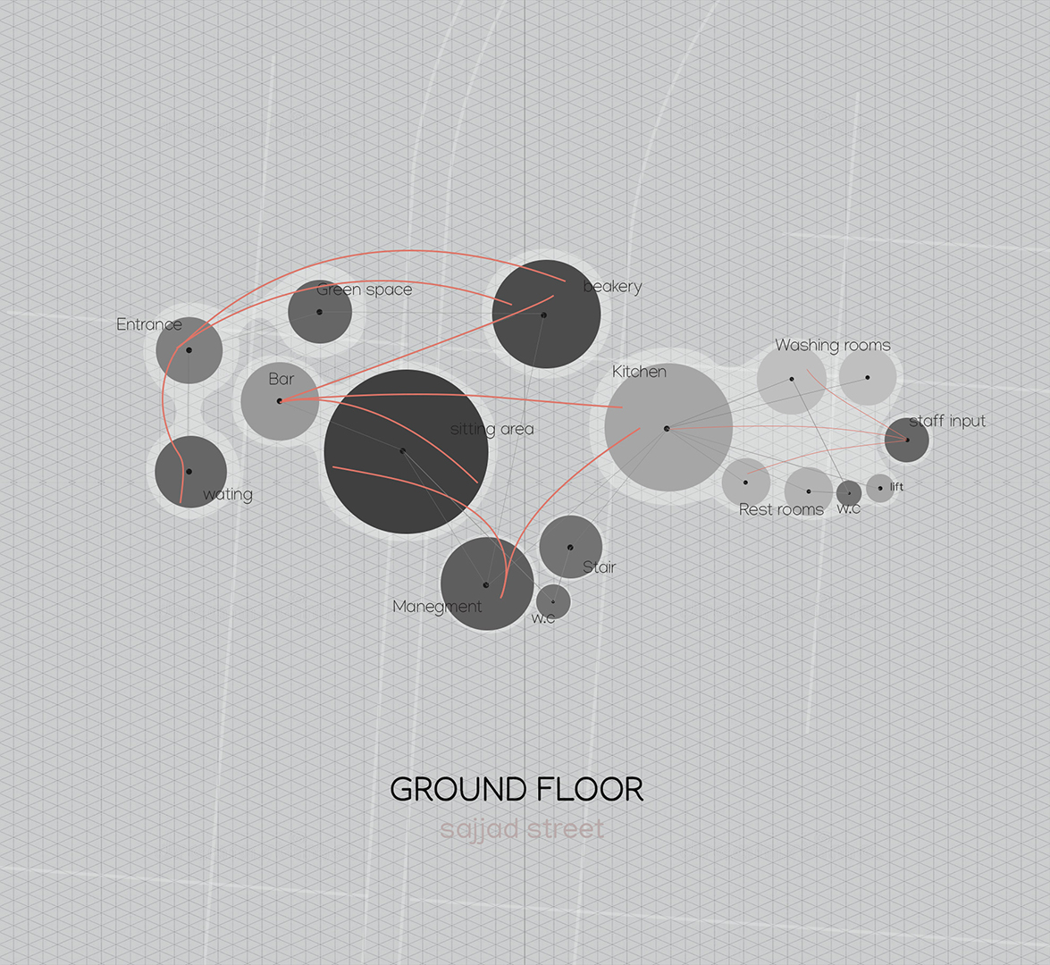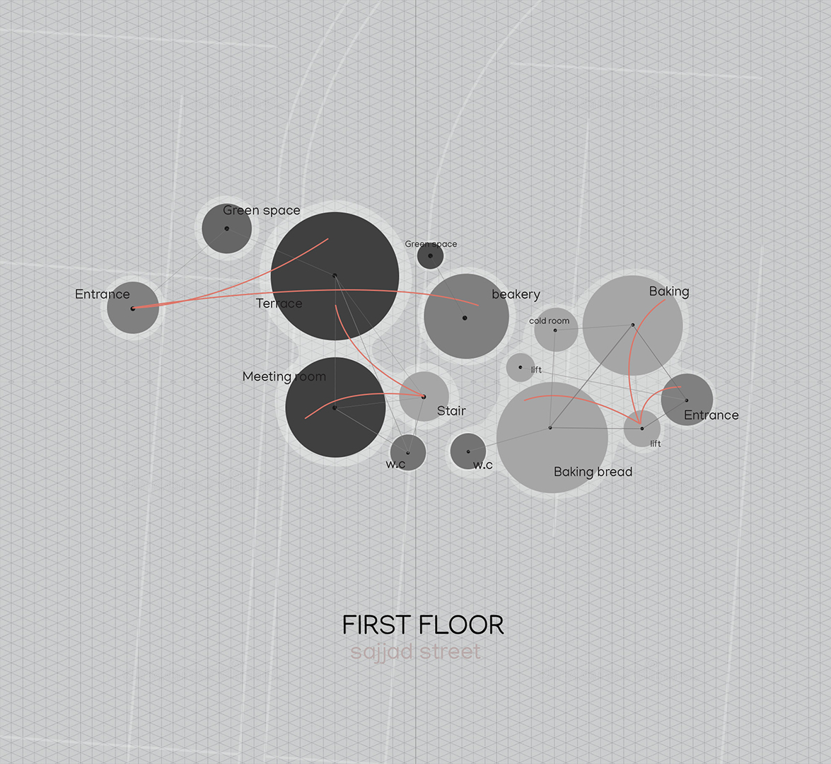 در تراز همکف، مسیر سبزی با شیب ملایم کاربران را به فضاهای عمومی هدایت میکند و پلکان فولادی معلق، دسترسی به حلقه حرکتی طبقات بالاتر را فراهم میآورد. طبقه دوم به فعالیتهای تولیدی اختصاص یافته و نیمطبقهای برای انبار در نظر گرفته شده است.