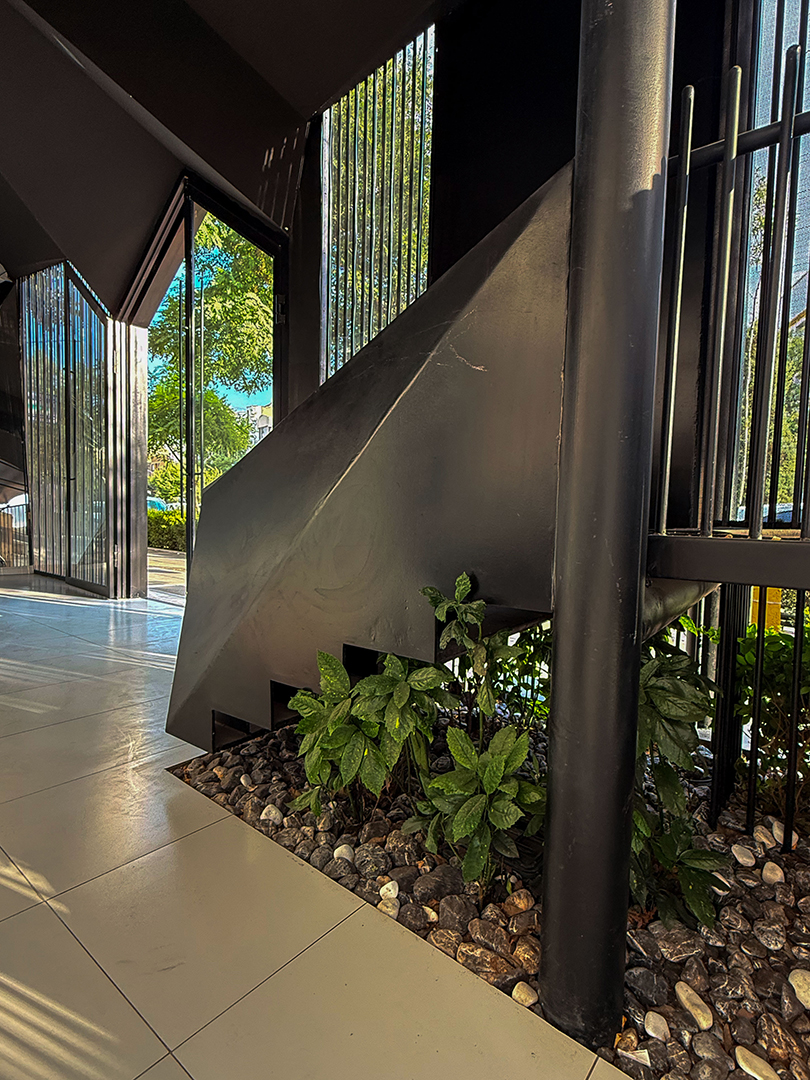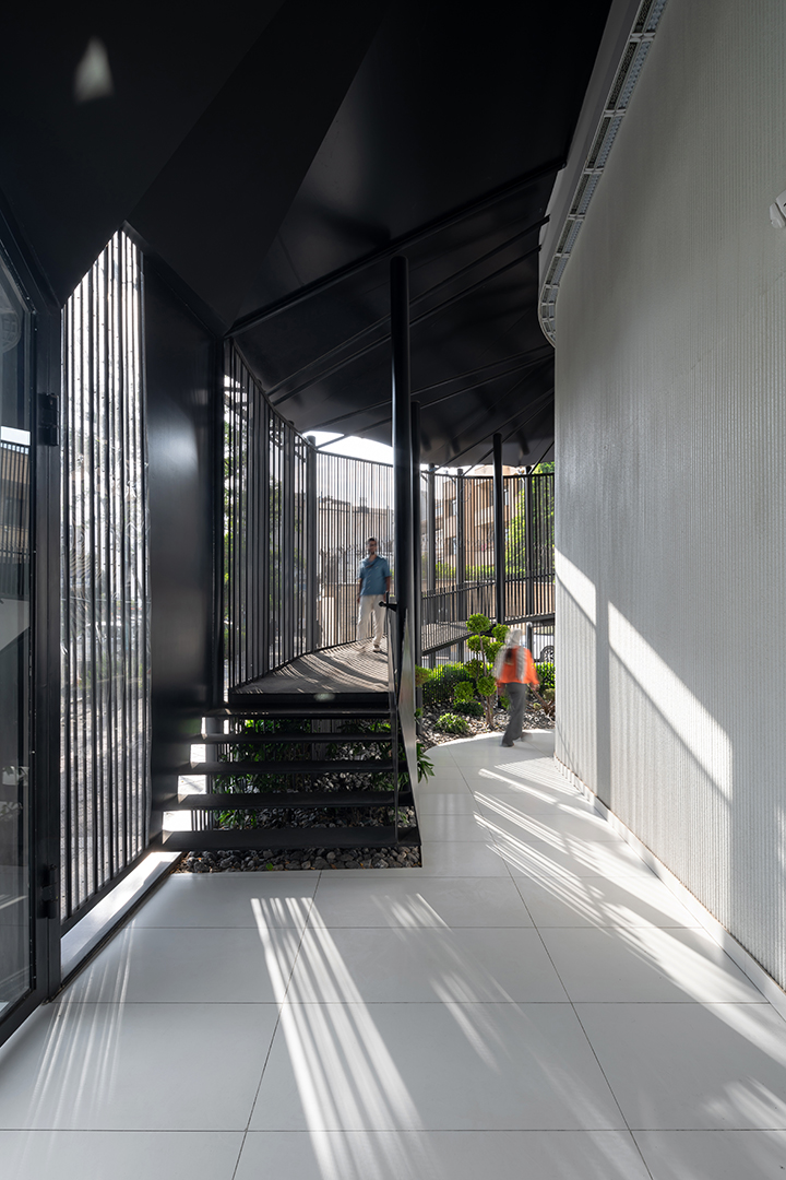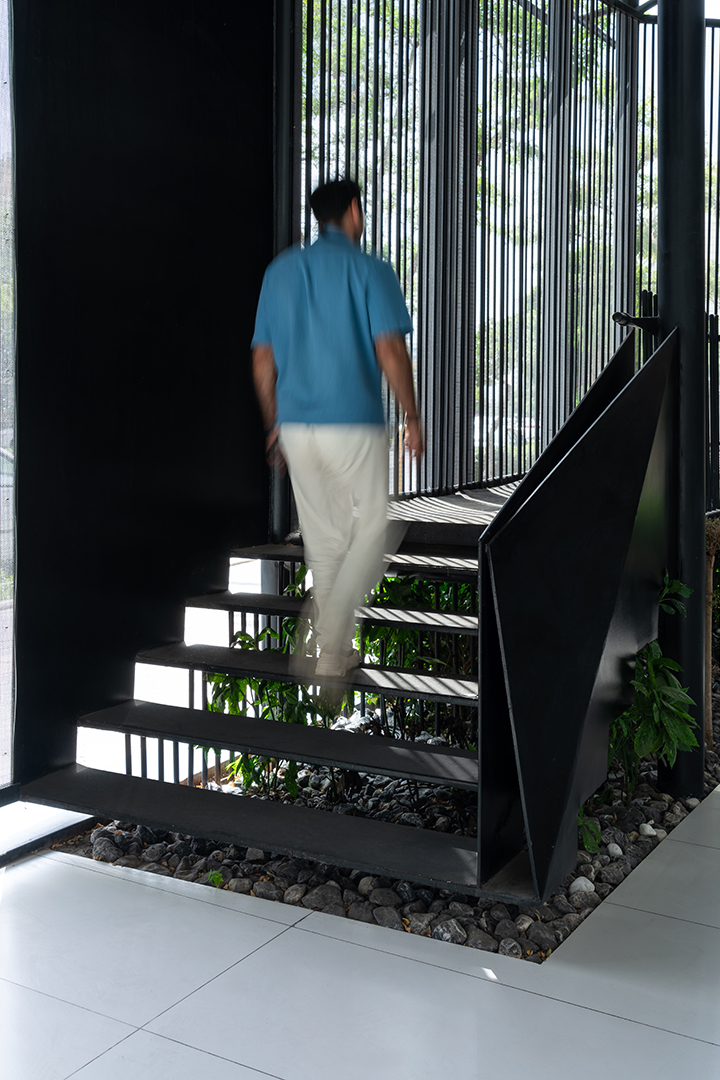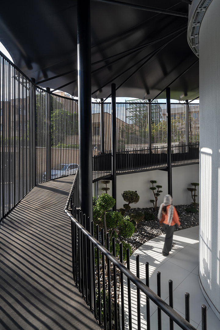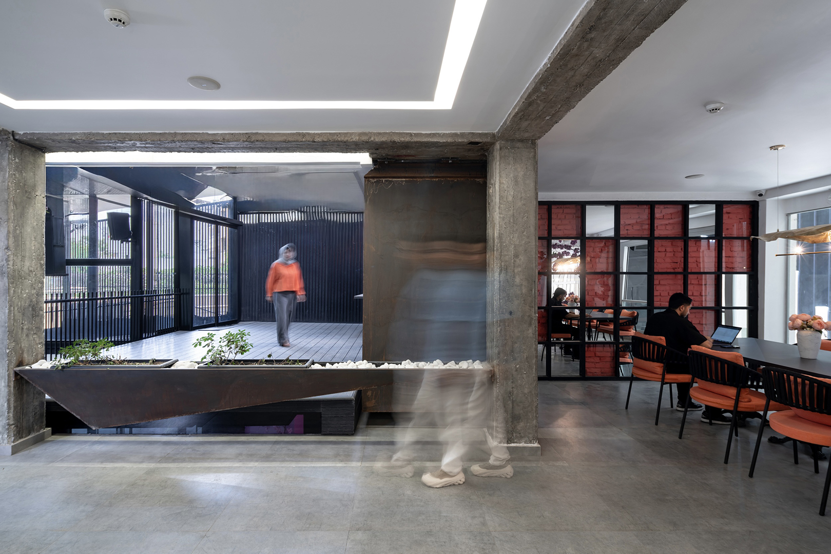 دو گذر مرتفع موازی، ستون فقرات حرکتی پروژه را شکل میدهند. این مسیرها از ورودی شفاف آغاز شده و بهصورت راهروهای نیمهباز در امتداد نمای ساختمان امتداد مییابند. جدارههای فلزی مشبک عمودی، پیوستگی بصری میان داخل و خارج را فراهم کرده و با حرکت کاربران، نما را پویا میسازند. این گذرها فضاهای متنوع پروژه از کافه و رستوران گرفته تا نانوایی، شیرینیپزی، فضای کار اشتراکی، اتاق جلسات و تراس اصلی را به هم متصل میکنند.
