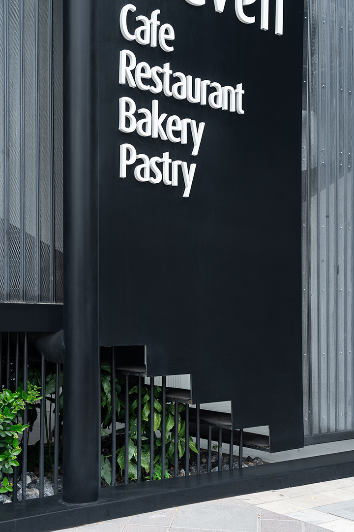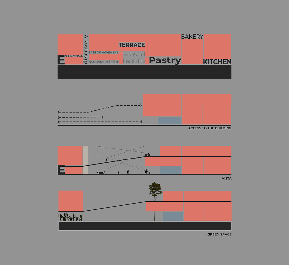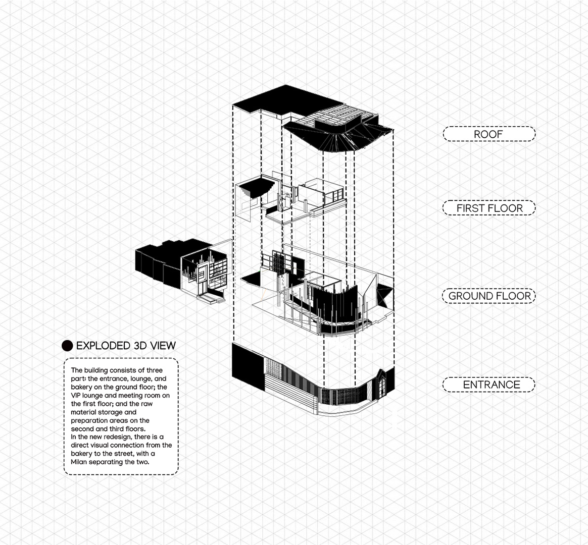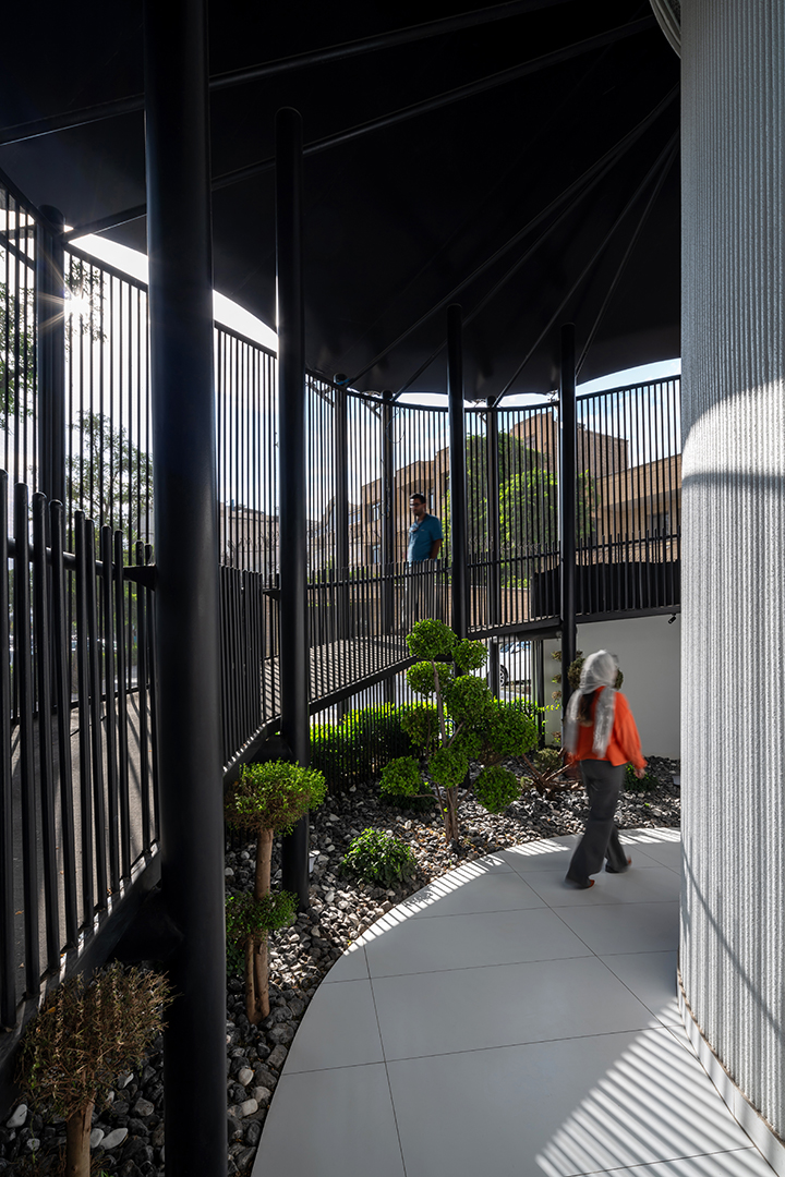 دو گذر مرتفع موازی، ستون فقرات حرکتی پروژه را شکل میدهند. این مسیرها از ورودی شفاف آغاز شده و بهصورت راهروهای نیمهباز در امتداد نمای ساختمان امتداد مییابند. جدارههای فلزی مشبک عمودی، پیوستگی بصری میان داخل و خارج را فراهم کرده و با حرکت کاربران، نما را پویا میسازند. این گذرها فضاهای متنوع پروژه از کافه و رستوران گرفته تا نانوایی، شیرینیپزی، فضای کار اشتراکی، اتاق جلسات و تراس اصلی را به هم متصل میکنند.