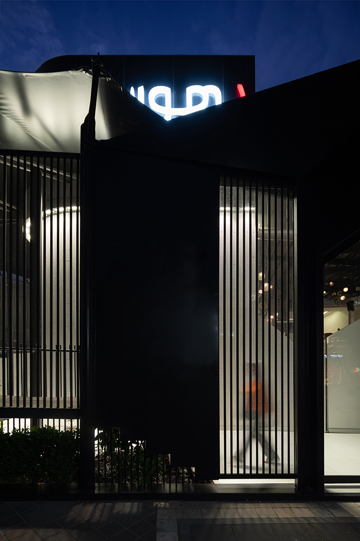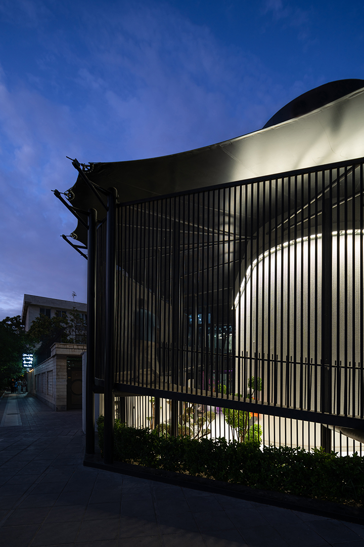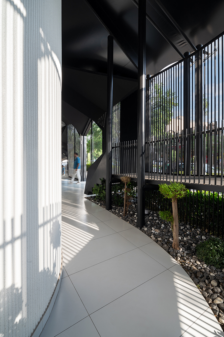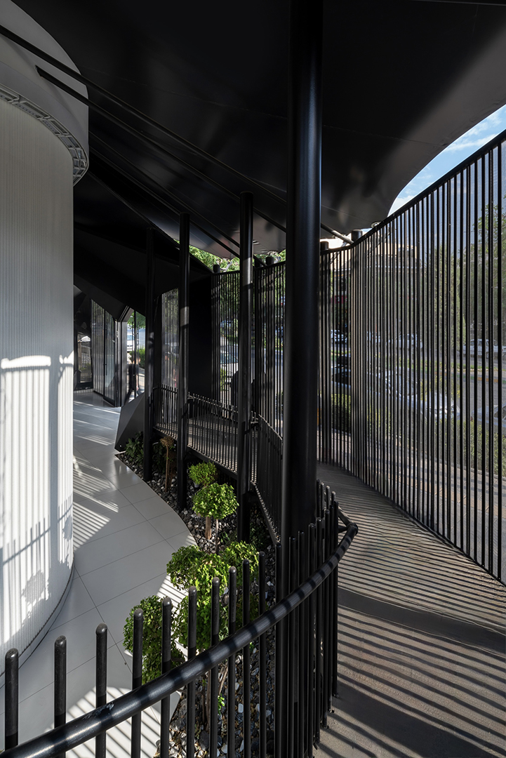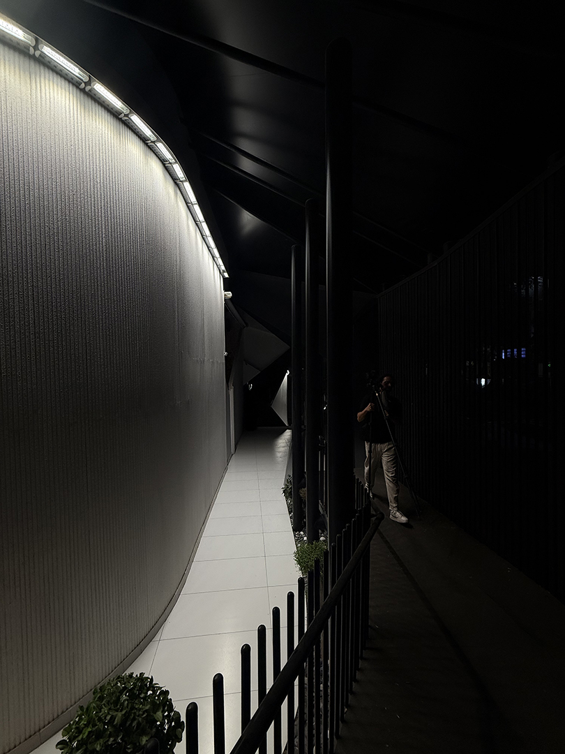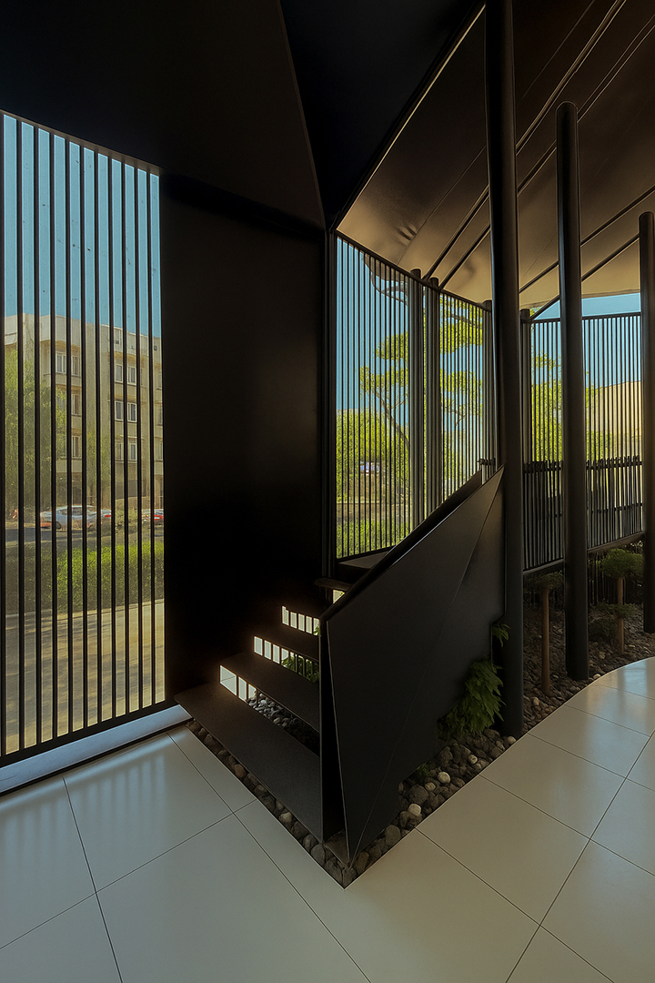 پوسته ساختمان با پوشش فولادی مشکی و صفحات مشبک عمودی طراحی شده که بازی نور و سایه را در طول روز شکل میدهد. این صفحات، تعادلی میان شفافیت و حریم ایجاد کرده و نور طبیعی را به الگوهای متغیر بر سطوح داخلی تبدیل میکنند. در شب، نورپردازی داخلی، مسیرهای حرکتی را همچون نوارهای درخشان در جداره شهری نمایان میسازد.