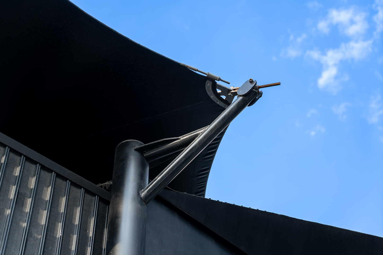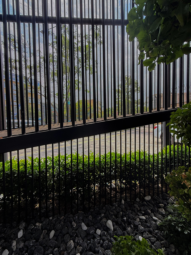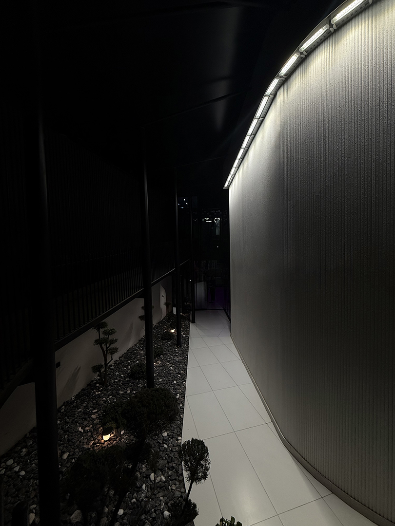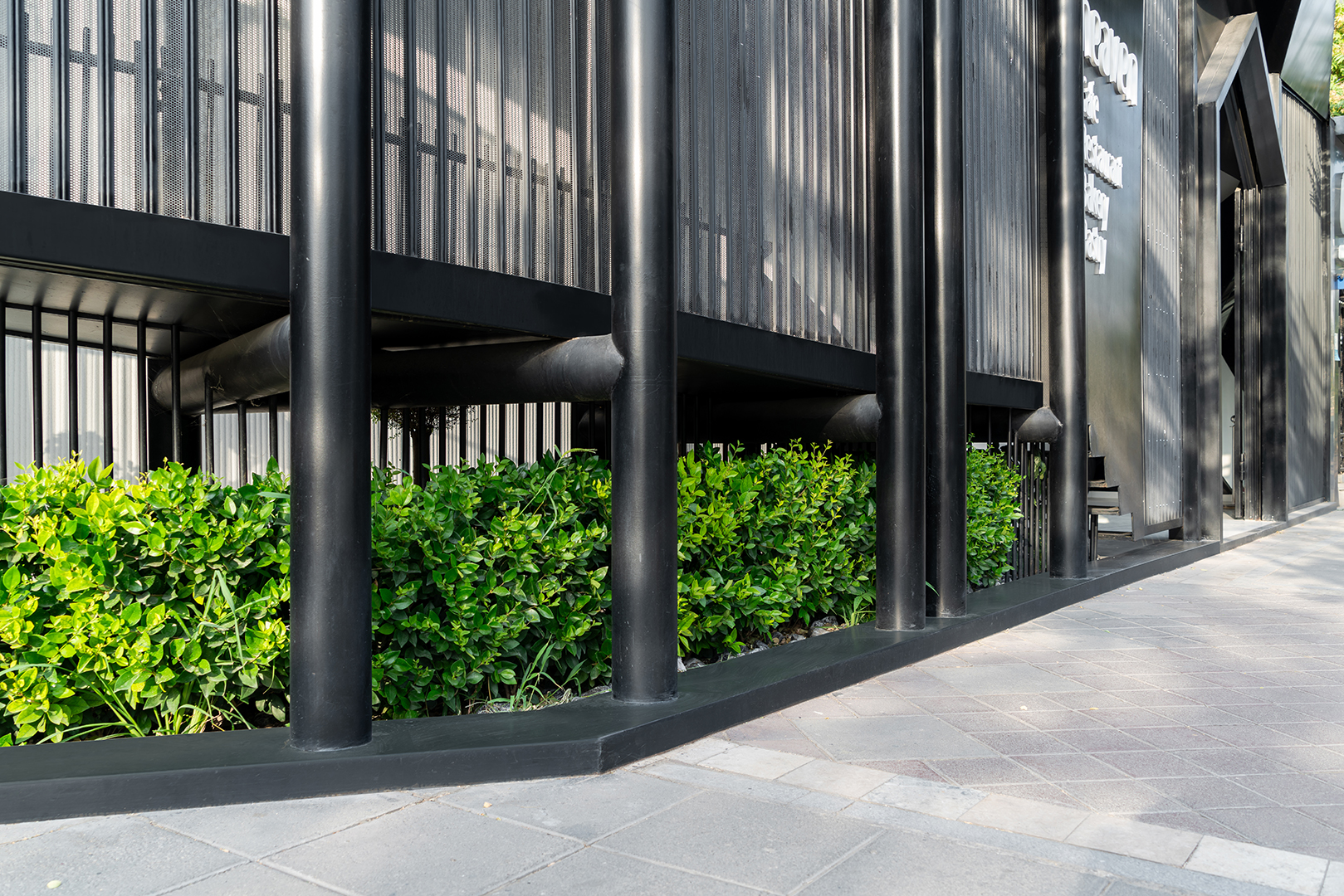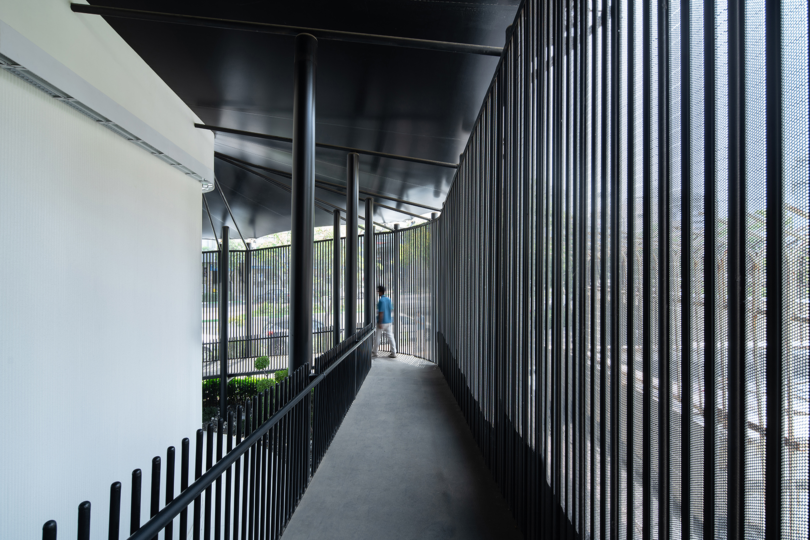 پوسته ساختمان با پوشش فولادی مشکی و صفحات مشبک عمودی طراحی شده که بازی نور و سایه را در طول روز شکل میدهد. این صفحات، تعادلی میان شفافیت و حریم ایجاد کرده و نور طبیعی را به الگوهای متغیر بر سطوح داخلی تبدیل میکنند. در شب، نورپردازی داخلی، مسیرهای حرکتی را همچون نوارهای درخشان در جداره شهری نمایان میسازد.